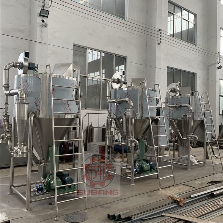 空氣經空氣過濾器后進入空氣加熱器,空氣加熱器的加熱方式有:熱風爐、電加熱、蒸汽加熱等。當空氣加熱到工藝要求的溫度后以切線方向進入熱風分配器,經熱風分配器作用后的空氣,均勻地、螺旋式進入干燥室,同時料液由霧化器霧化為25-60μm的霧滴,當霧滴與熱空氣接觸后就迅速汽化干燥為粉末或顆粒產品。干燥的粉末或顆粒產品落到干燥室的錐體四壁并滑行至錐底進入積粉筒,少量細粉隨空氣流入旋風分離器進行分離,最后廢氣由風機排出口排出,或進入濕式除塵器后排出。