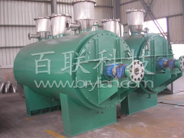 本機(jī)是一種新穎臥式間歇式真空干燥設(shè)備,濕物料經(jīng)傳導(dǎo)蒸發(fā),帶有刮板攪拌器不斷清除熱面上的物料,并在容器內(nèi)推移形成循環(huán)流,水份蒸發(fā)后由真空泵抽出。