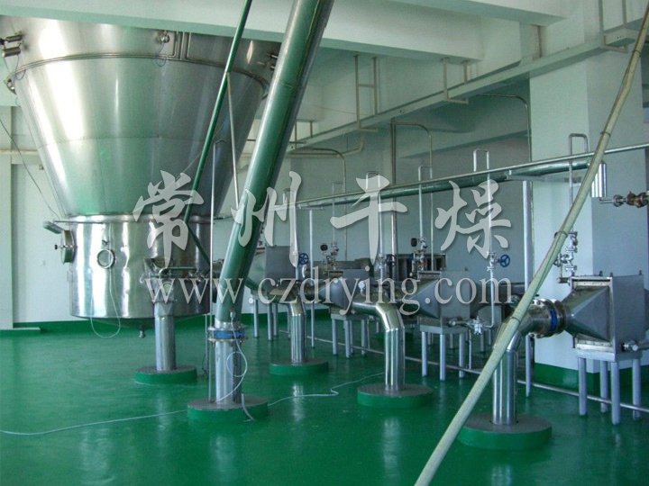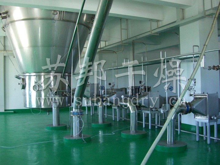 該生產(chǎn)線(xiàn)由供料系統(tǒng)、介質(zhì)循環(huán)系統(tǒng)、空氣加熱凈化系統(tǒng)、干燥塔系統(tǒng)、收料系統(tǒng)、控制系統(tǒng)等多個(gè)系統(tǒng)整合而成。主塔系統(tǒng)集中了目前噴霧干燥工程的所有尖端技術(shù),噴干機(jī)組的收料系統(tǒng)由一級(jí)旋風(fēng)分離器+布袋除塵器組合形成。一級(jí)旋風(fēng)采用高氣量高效率旋風(fēng)進(jìn)行收集,其收粉率能達(dá)到96%左右分,而布袋除塵器是針對(duì)蛋白粉類(lèi)除塵專(zhuān)門(mén)設(shè)計(jì)的優(yōu)化設(shè)備,能使物料與風(fēng)進(jìn)行完全分離并沉降,布袋為拒水防油防靜電布袋,過(guò)濾目數(shù)可達(dá)500目以上。