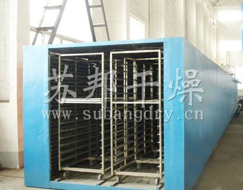 隧道烘箱料盤放置于小車上,循環(huán)風經(jīng)過熱源換熱后吹過物料表面,進行干燥。如需要物料翻身可以將車從烘箱內拉出。