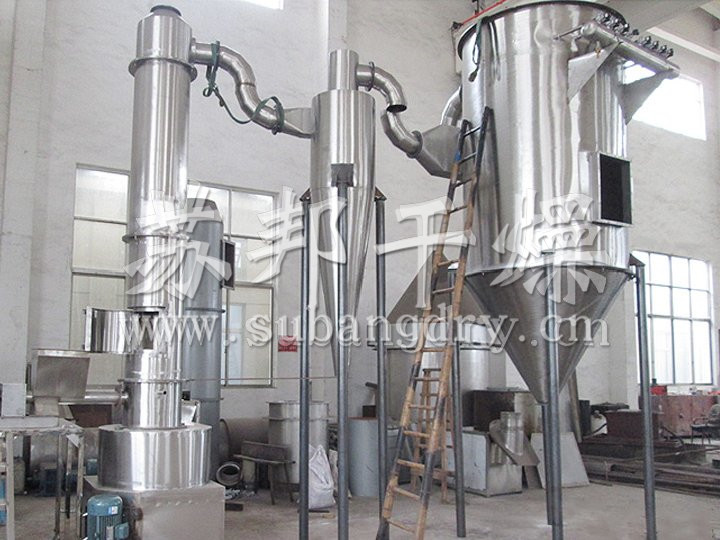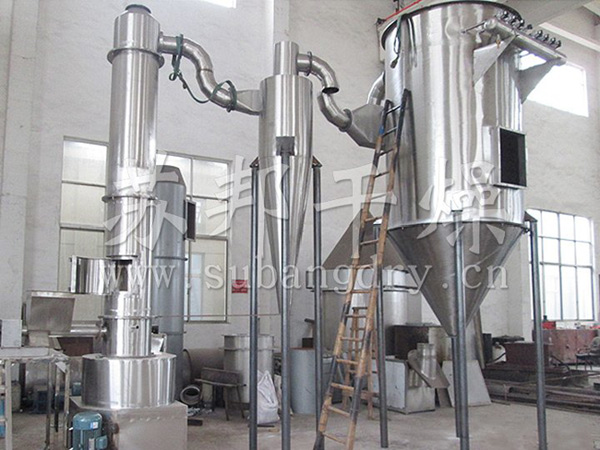 豆沙由螺旋加料機定量加入閃蒸干燥機內(nèi),熱風(fēng)由干燥機的底部切線進入,產(chǎn)生高速螺旋向上的氣流,濕料在高速氣流的沖擊和機內(nèi)攪拌的共同作用下,在被干燥的同時,粒子也被粉碎和分級。粒子越小,氣固傳熱的速度越快。小粒子在旋轉(zhuǎn)氣流的作用下,由干燥機下部的流化段上升至上部的干燥段合格品由頂部分級器與熱風(fēng)一起進入旋風(fēng)分離器,經(jīng)分離收集成為成品包裝;而粒子較大和濕度較高的粒子,在重力和離心力的作用下,重新回落到干燥機的中、下段,再次粉碎和干燥。